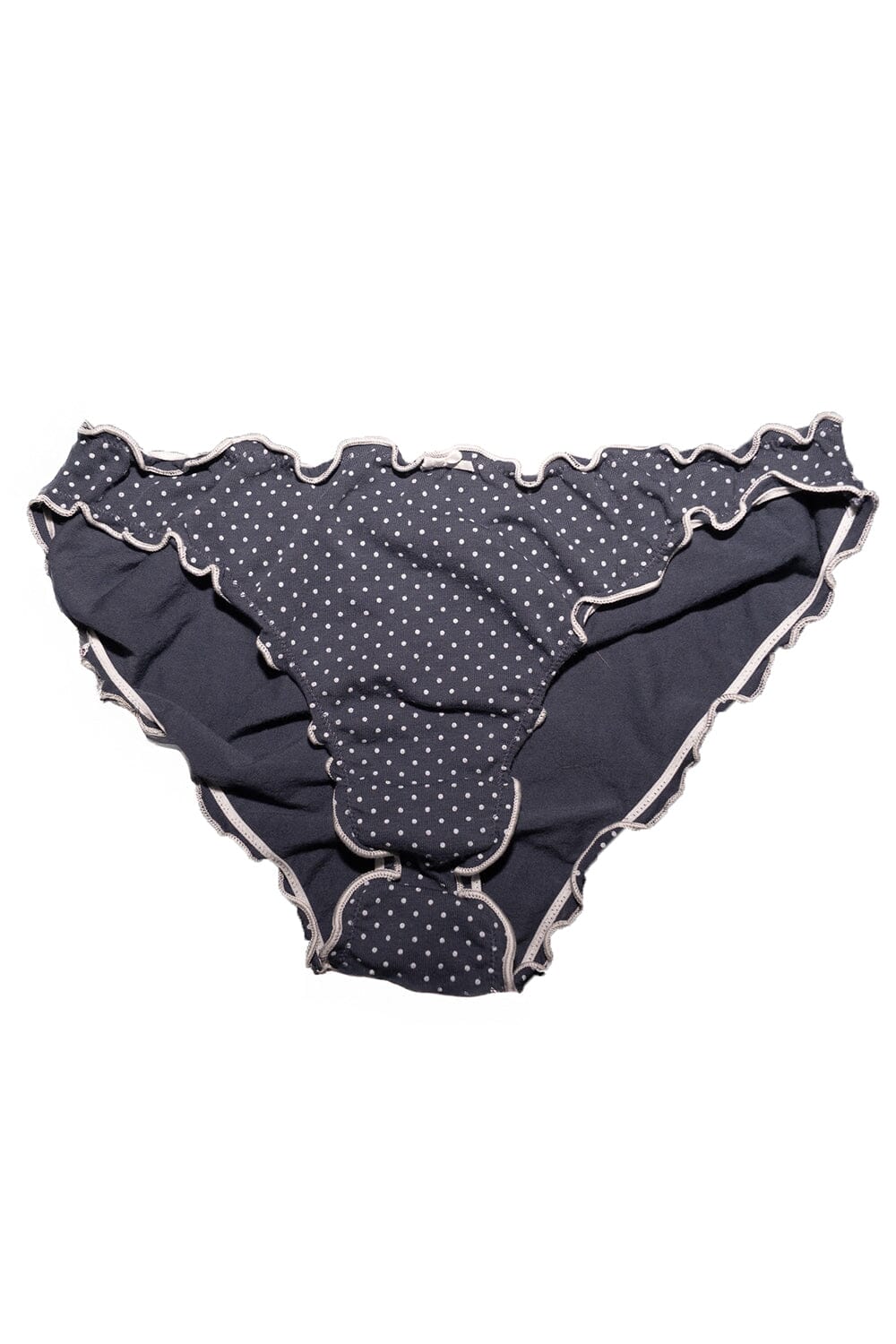 Soft, polka dots, cotton underwear with an elastic lace waistband, scalloped trim and a bow.