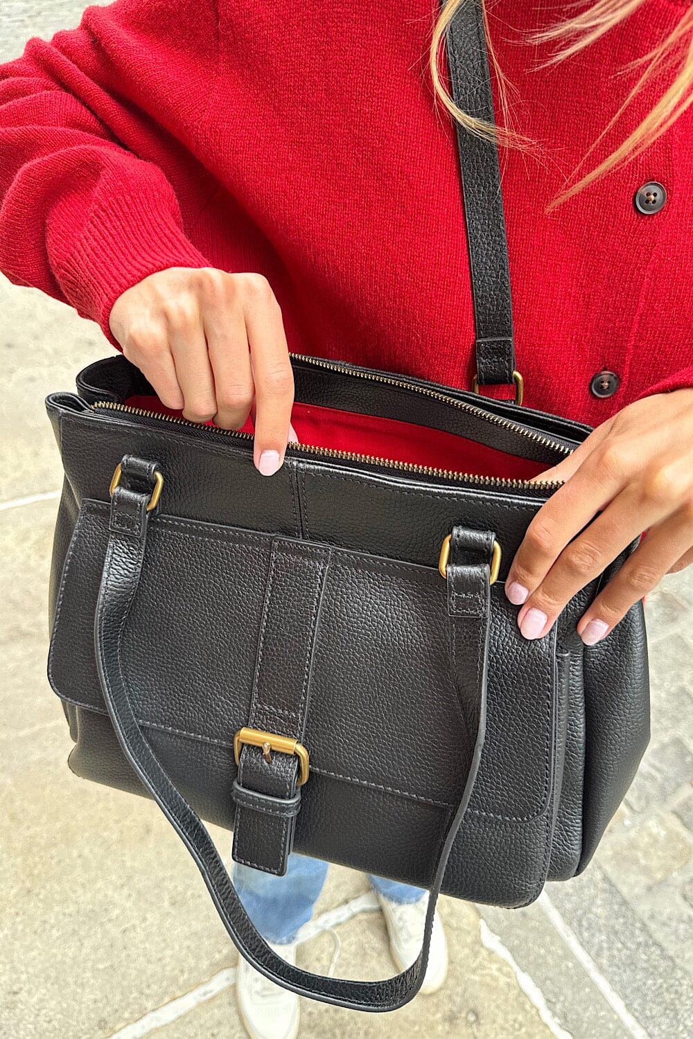 Leather buckle bag with pockets inside and outside, gold hardware, red lining inside.