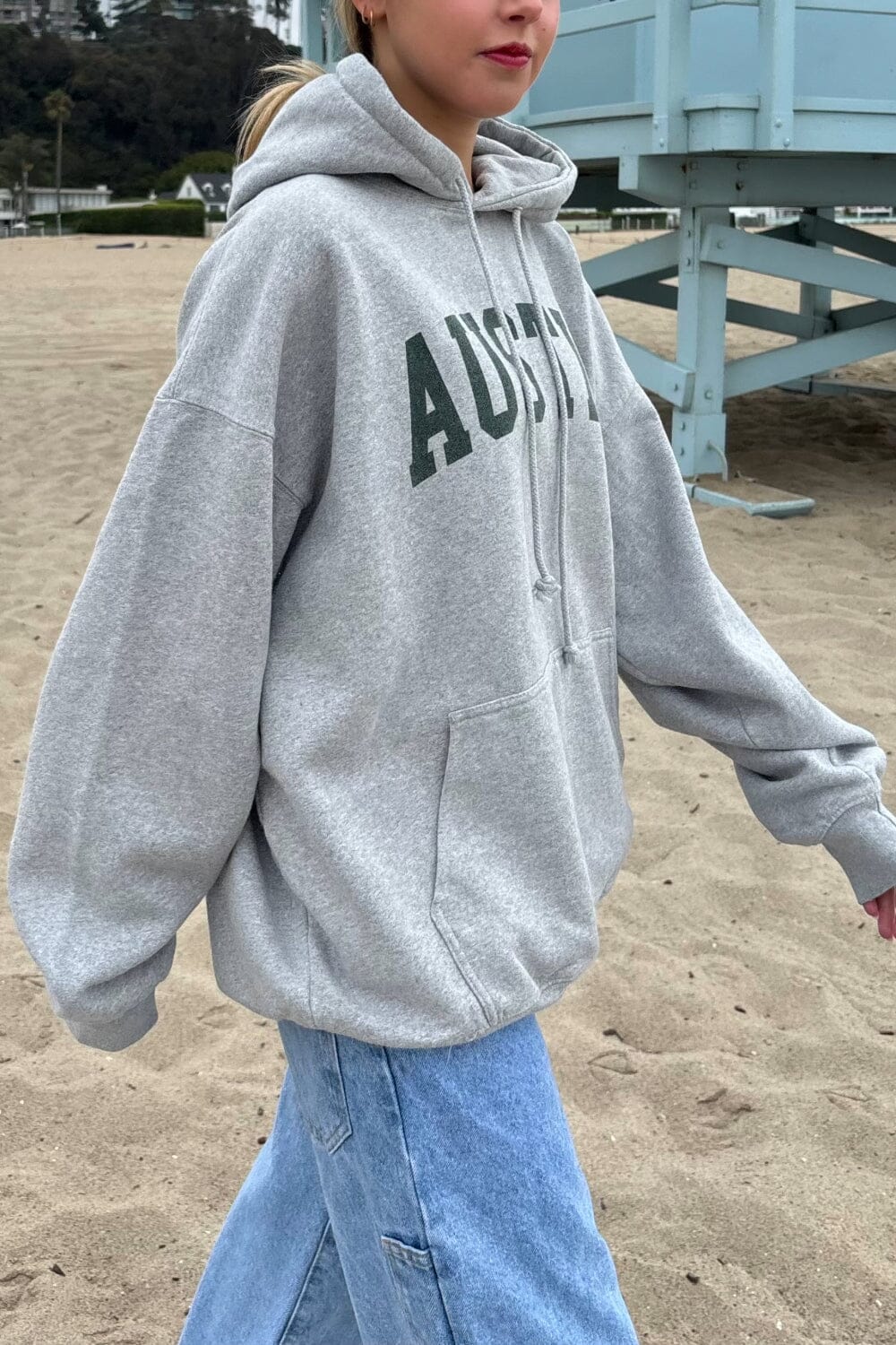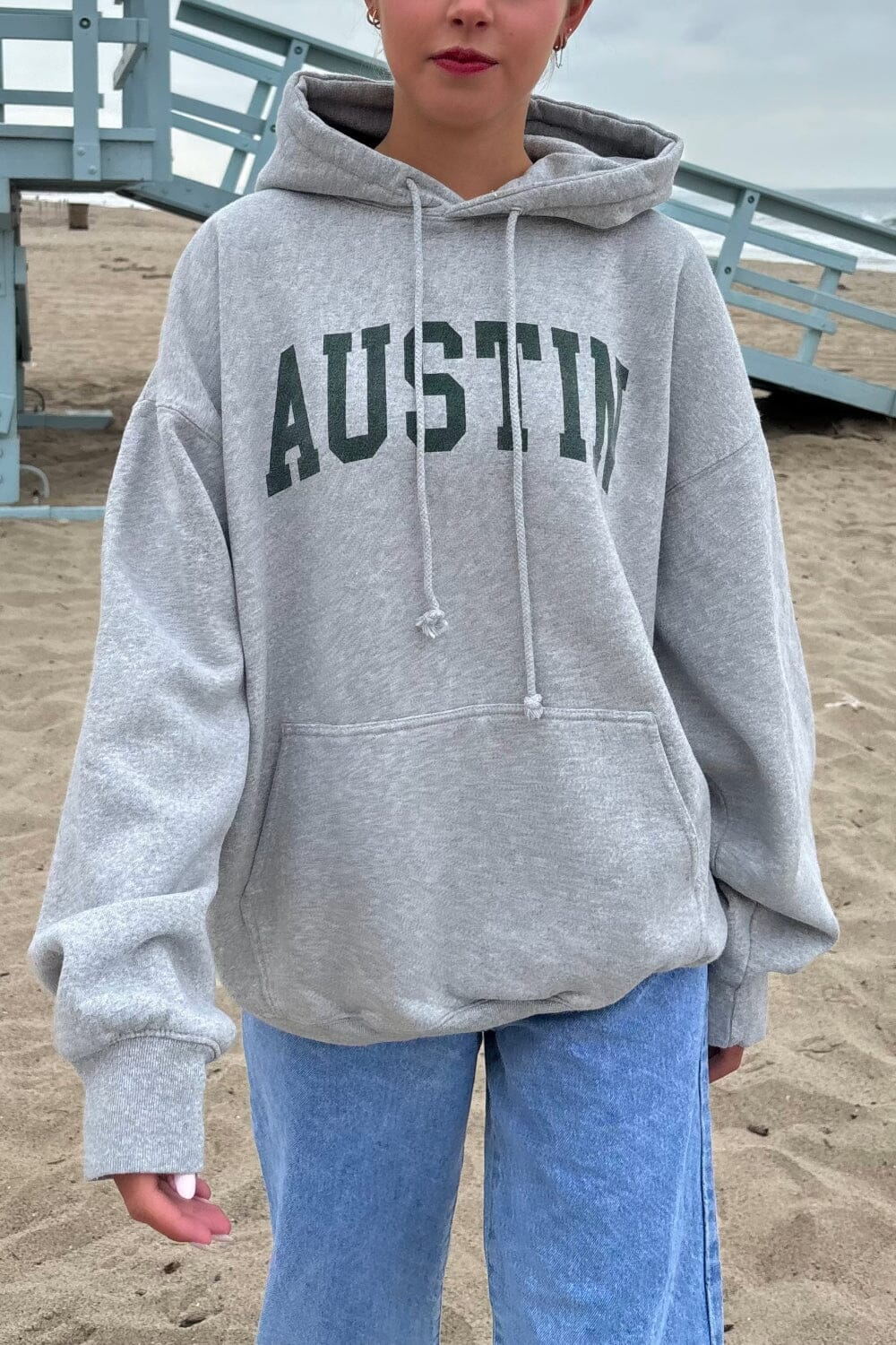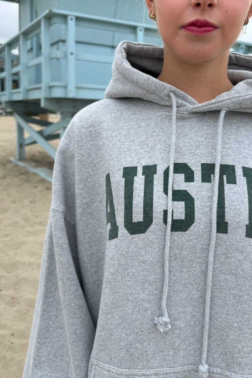 Soft, oversized fit hoodie with the AUSTIN Graphic printed in dark green on the chest, drawstrings, and kangaroo pockets.