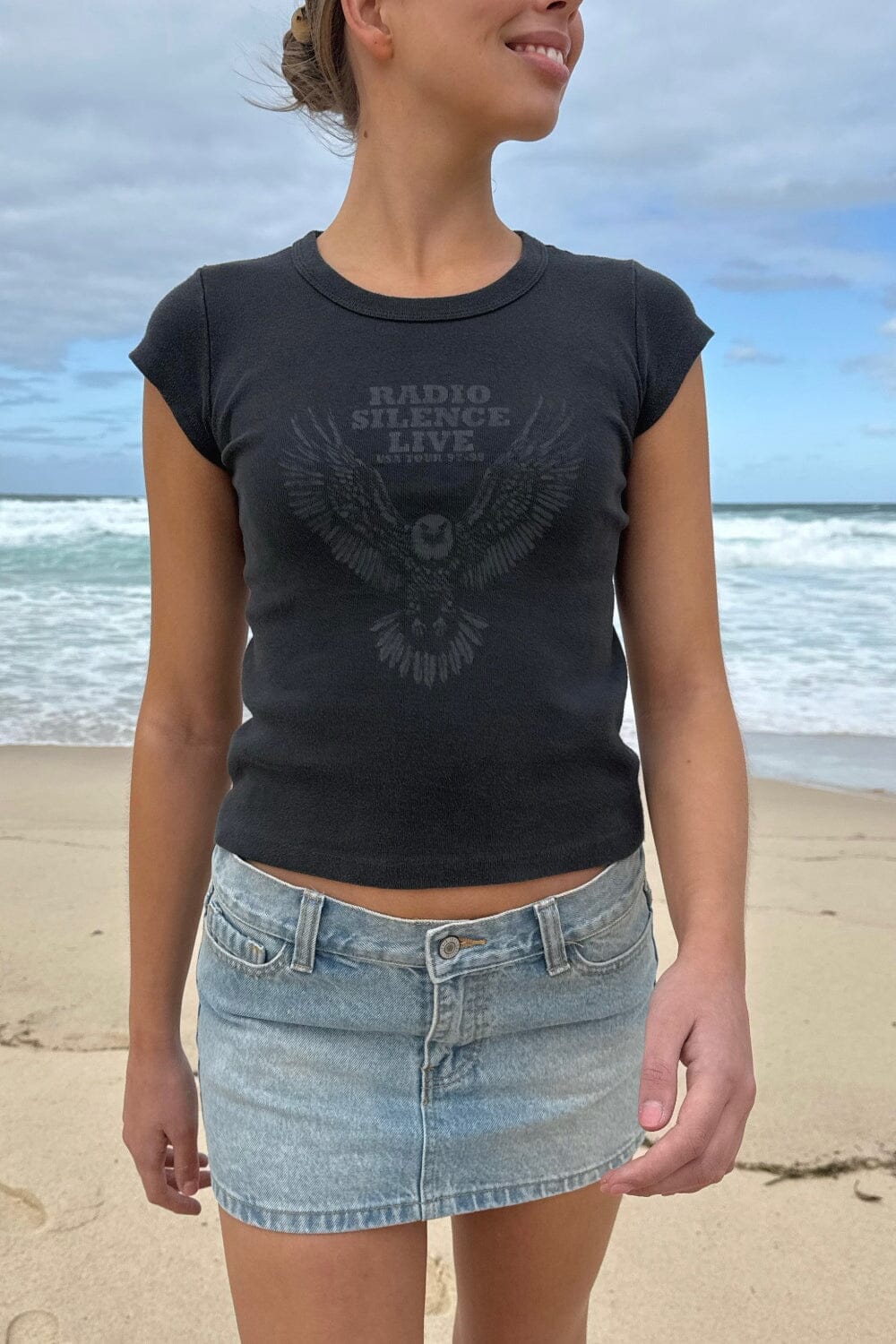 Soft and stretchy cotton tee with a crewneck collar and the Radio Silence Live graphic on the front.