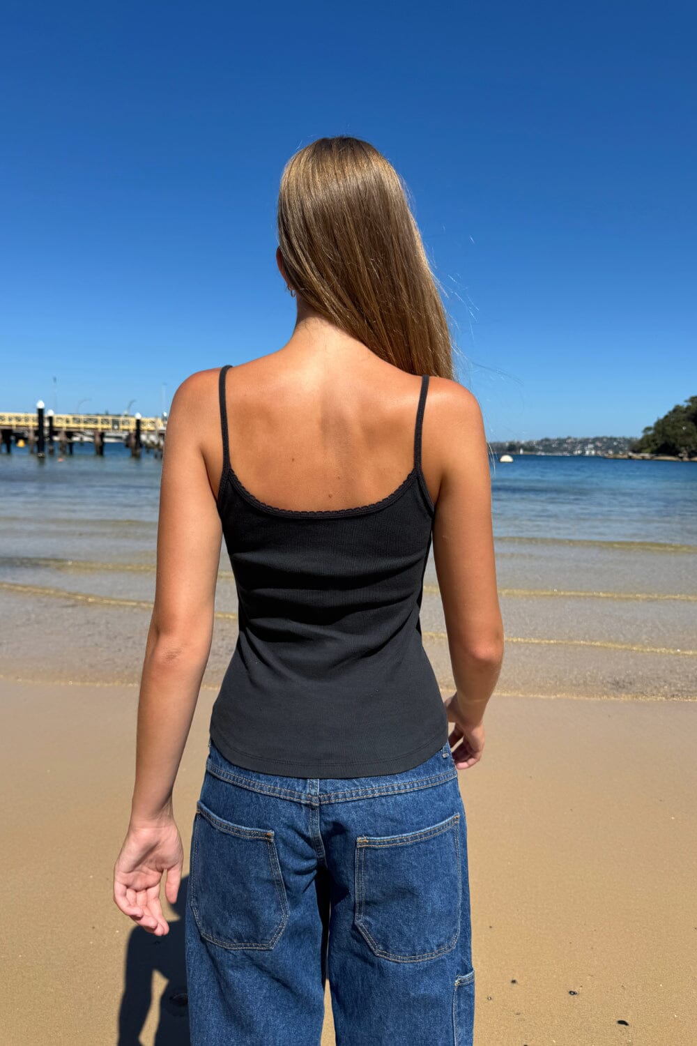 Spaghetti strap tank top in black with the Sturgis Black Hills Rally 2002 graphic embroidered on the front with a scoop scallop neck.