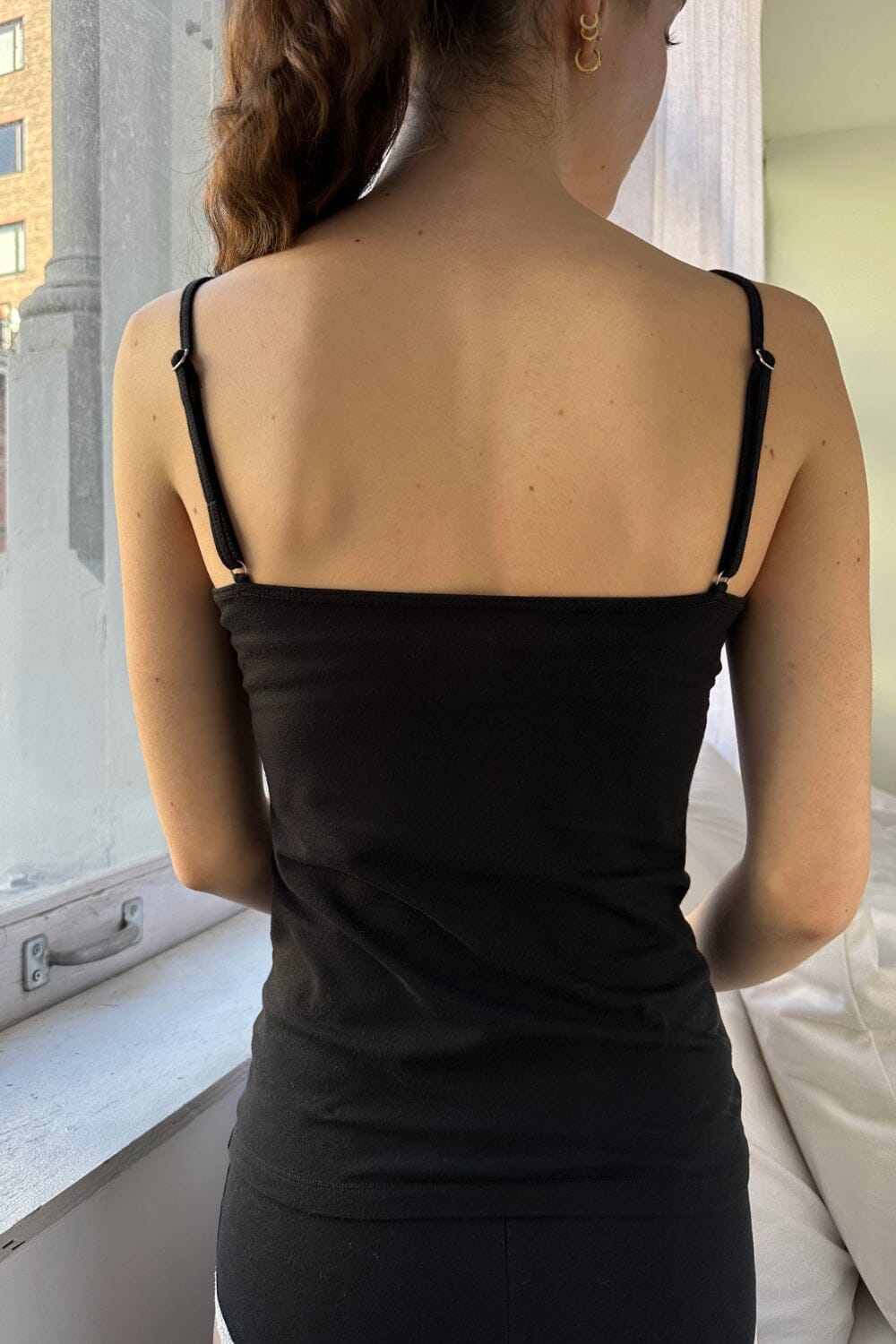 Tank with thin straps, fitted detail at the bust, white lace and bow.
