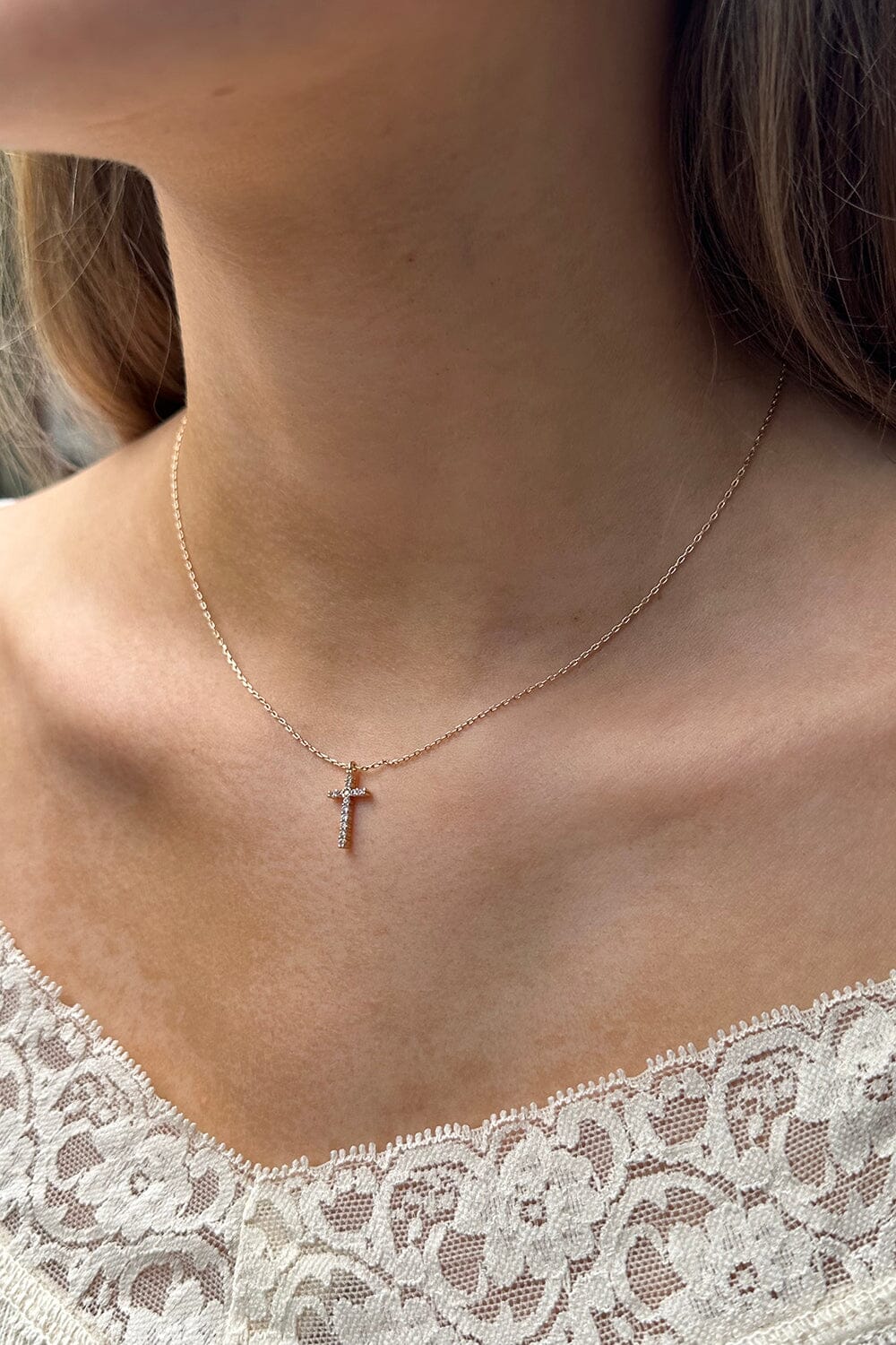 Dainty chain necklace with a small faux rhinestone cross charm and adjustable lobster clasp closure.