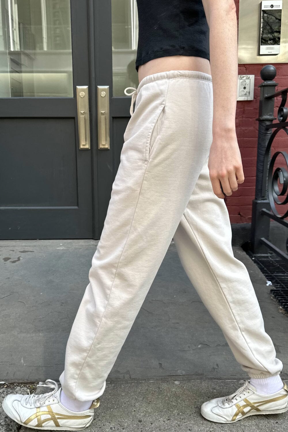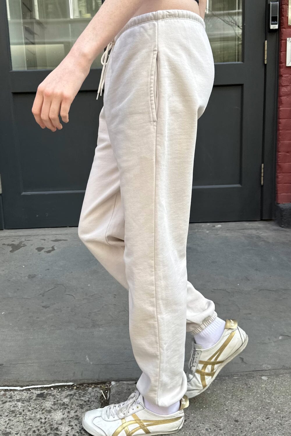 Thick and cozy cotton sweatpants with wide leg, drawstring waistband, side pockets.
