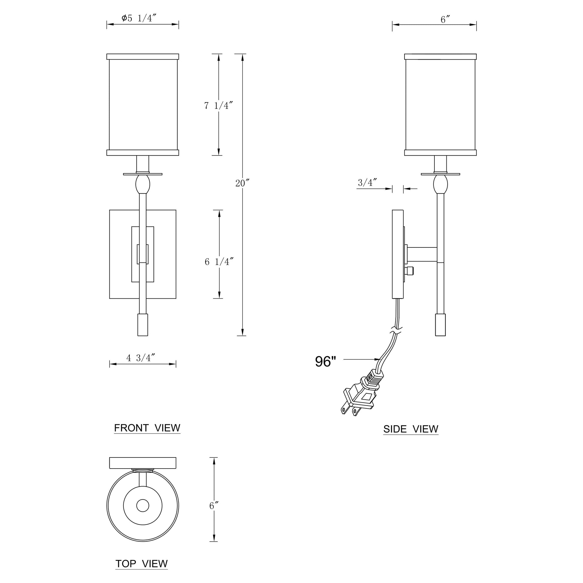 - Product Dimensions: The overall fixture is 20'' H x 5.25'' W x 6'' E, the fabric shade is 5.25'' D x 7.25'' h, the wall plate is 4.75' W x 6.25' H x 0.75'E, the length of plug in cord is 8ft.