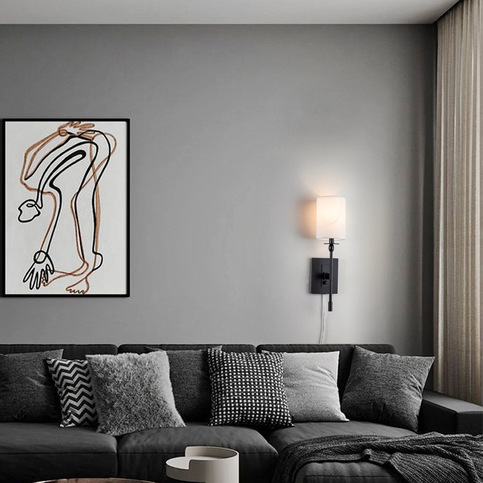 Add modern style to seating areas or bedrooms with this wall lamp. Easy to install, the fixture can be hardwired or plug in, adds instant style and light to any setting. The set features a streamlined modern profile with white fabric drum shades. The wall plate and top arm come in a matte black metal finish. An on-off dimmer switch on the plate gives you easy lighting control.
