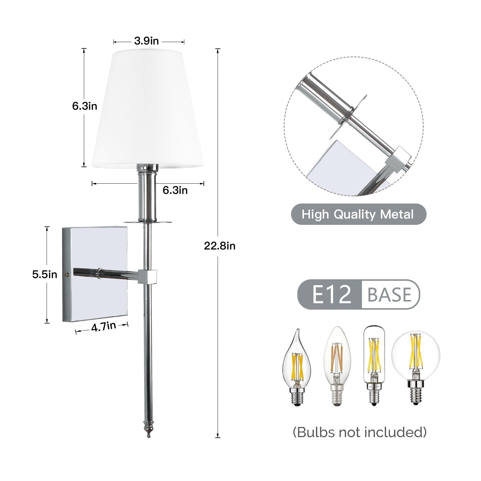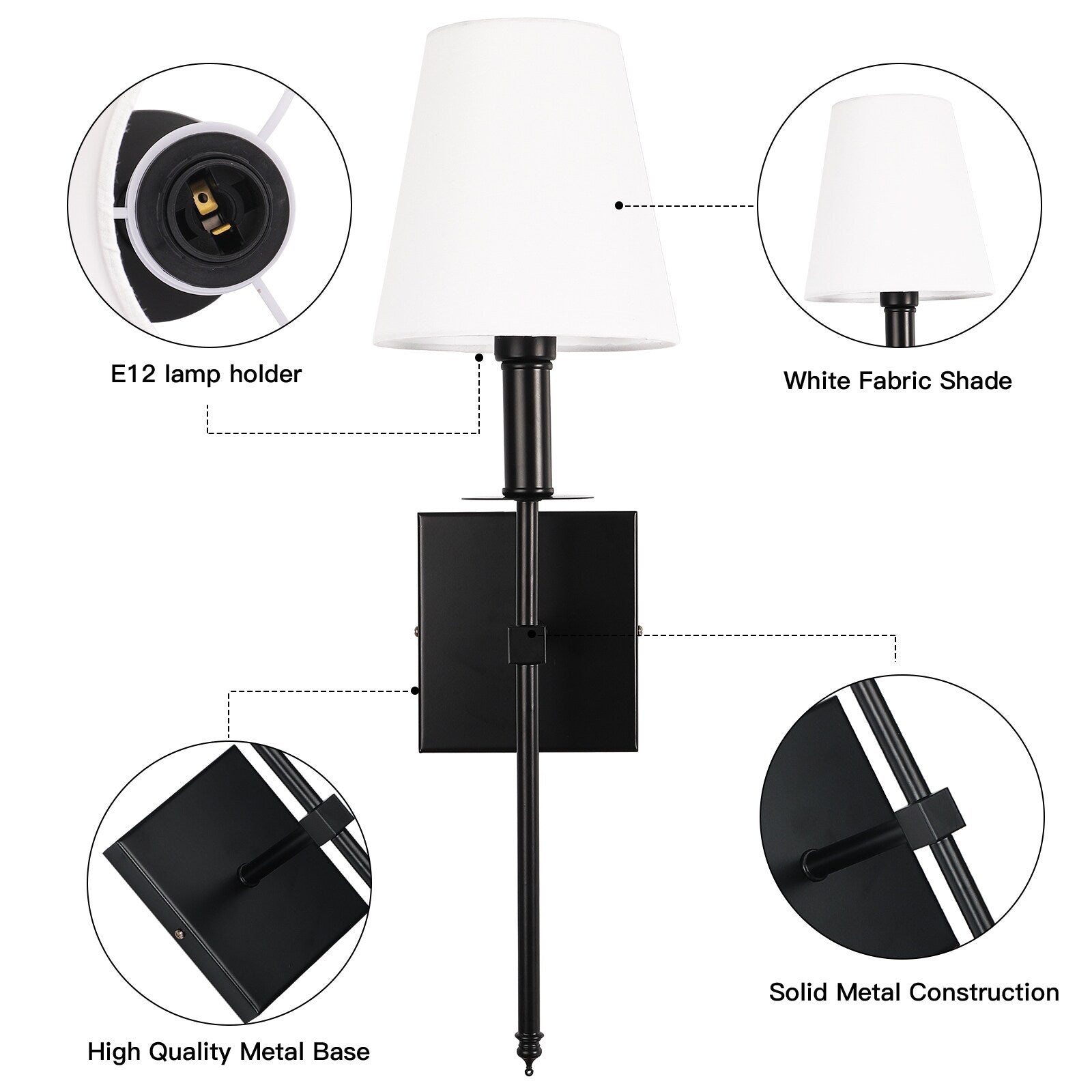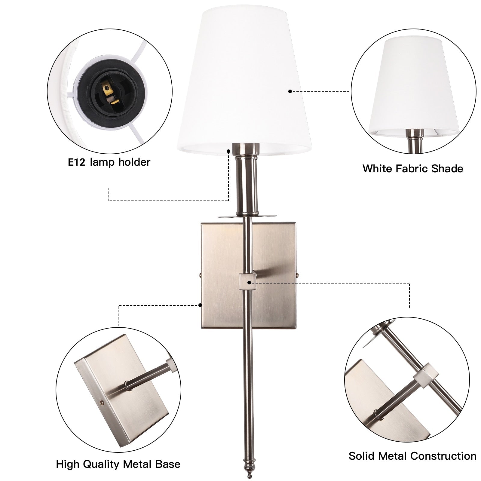 The wall sconce features elegant long column stand arm and sturdy metal base ,won't oxidize and fade. Flared white fabric shade, soften the glare, protecting your eyes and bringing you a comfortable and relaxing atmosphere.blends with many decor styles and completely transform your space.A fabric empire shade caps this sconce and diffuses the light throughout your living room ,dining room ,or powder room.You can use it as a bedside night wall lights, reading wall lamp and other multifunctional wall sconces.