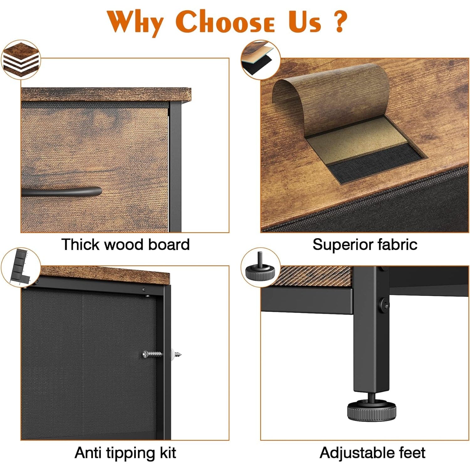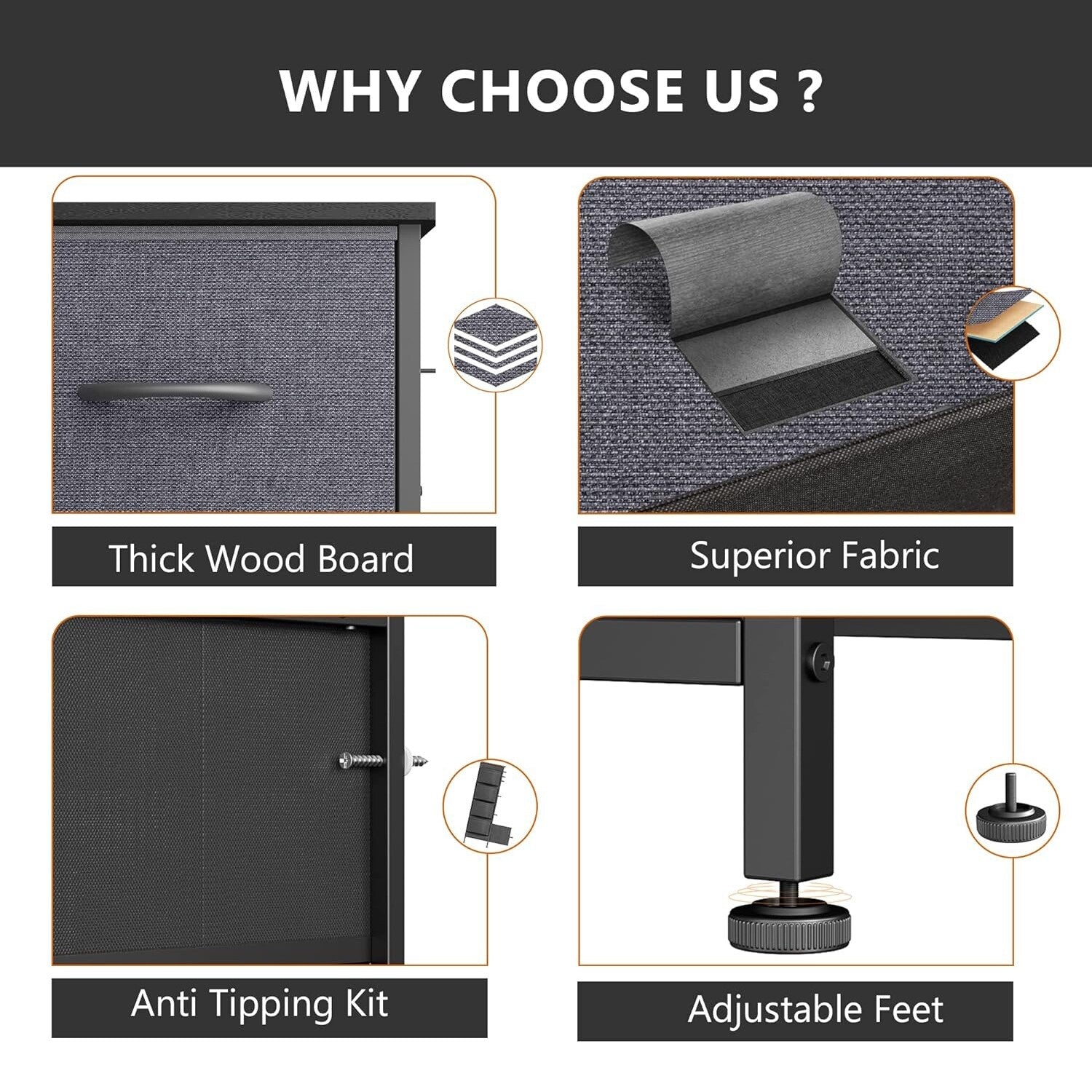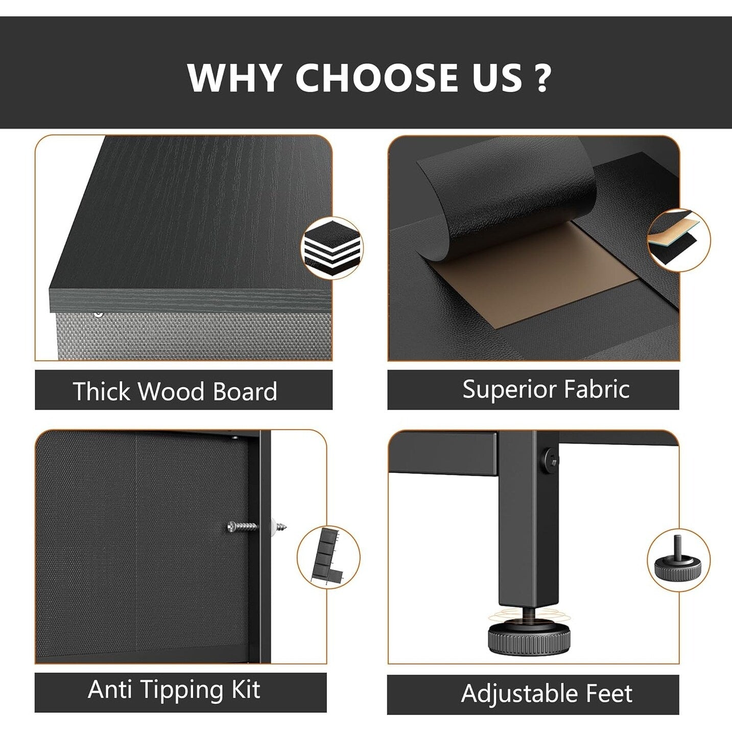 - Material: MDF Wood Board, Metal Frame, Fabric Drawers