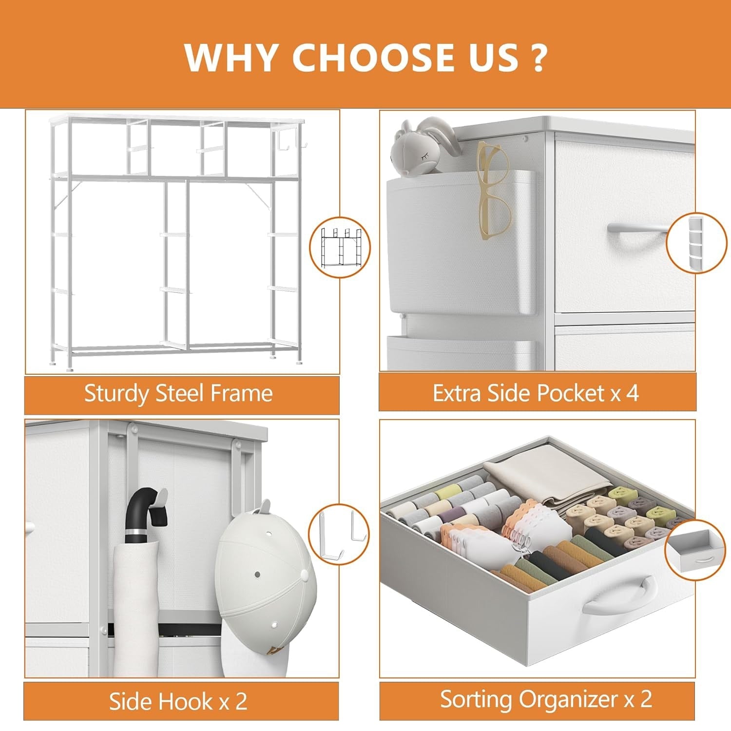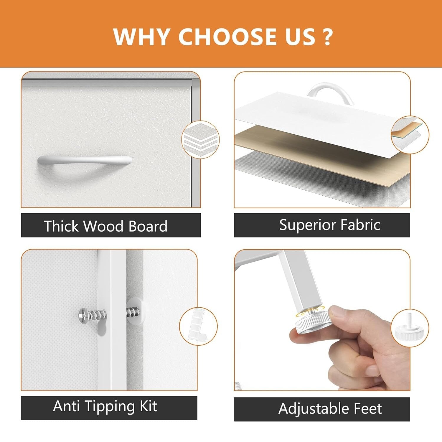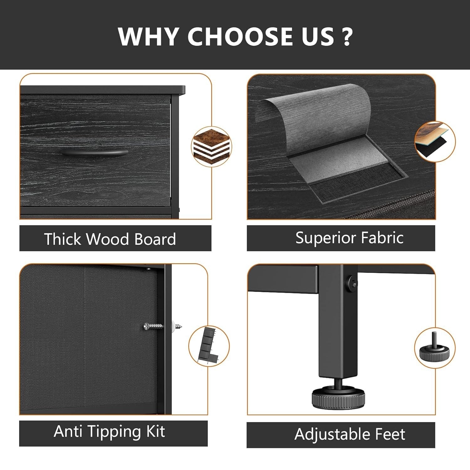 - Material: MDF Wood Board, Metal Frame, Fabric Drawers