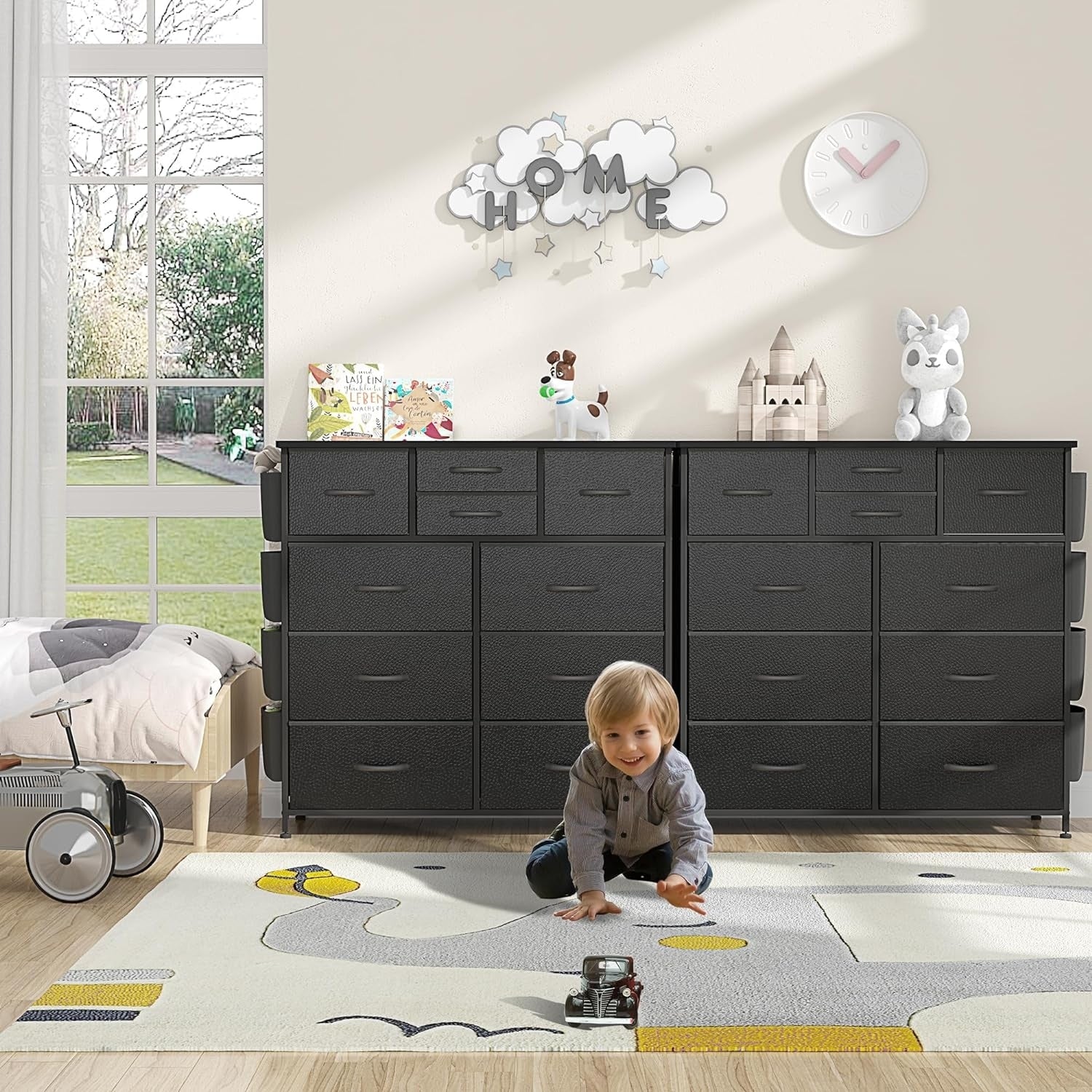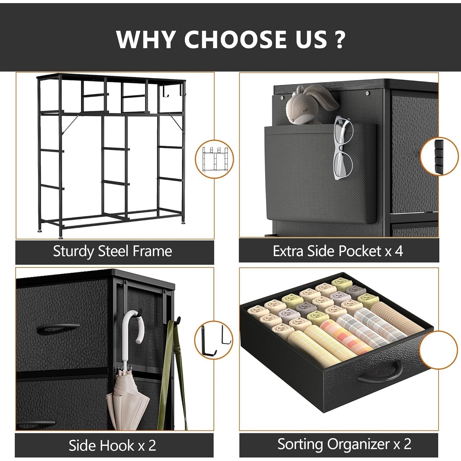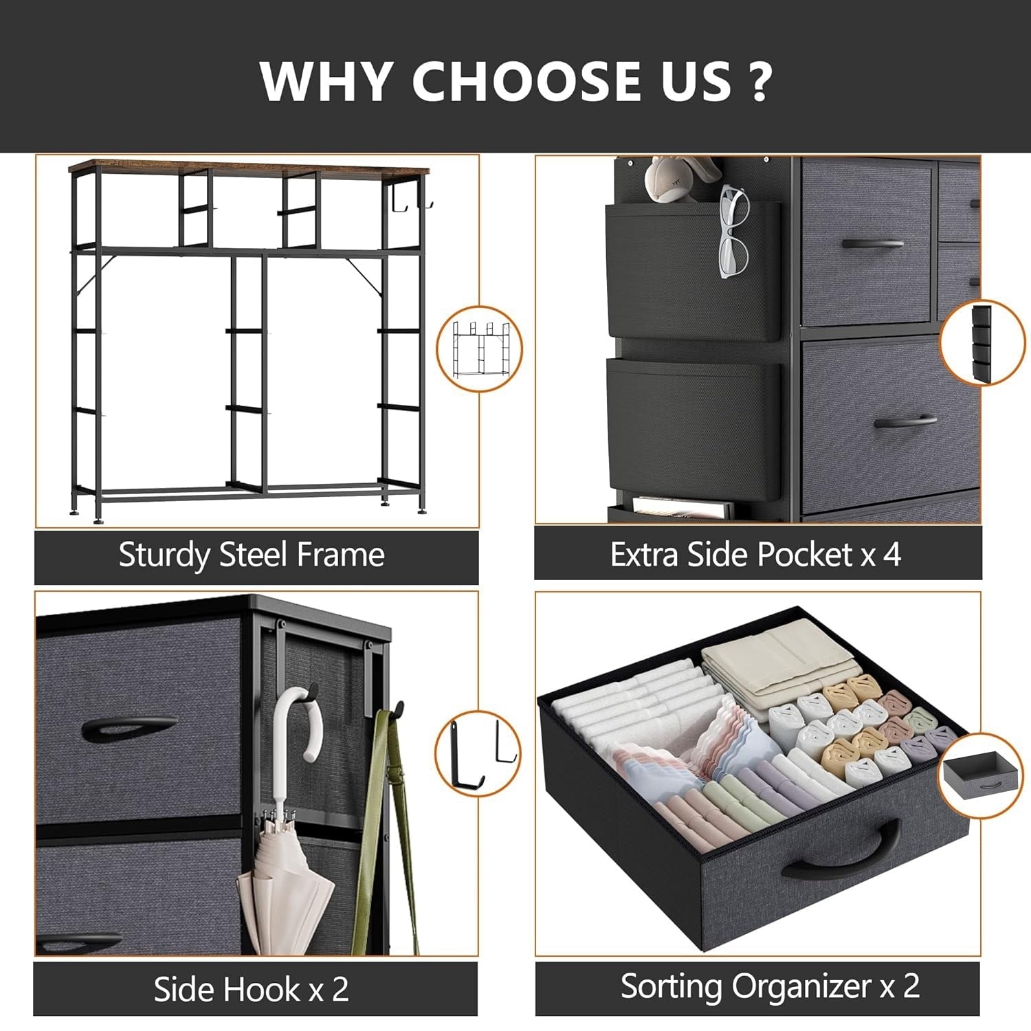 - Large storage space with 10 fabric drawers