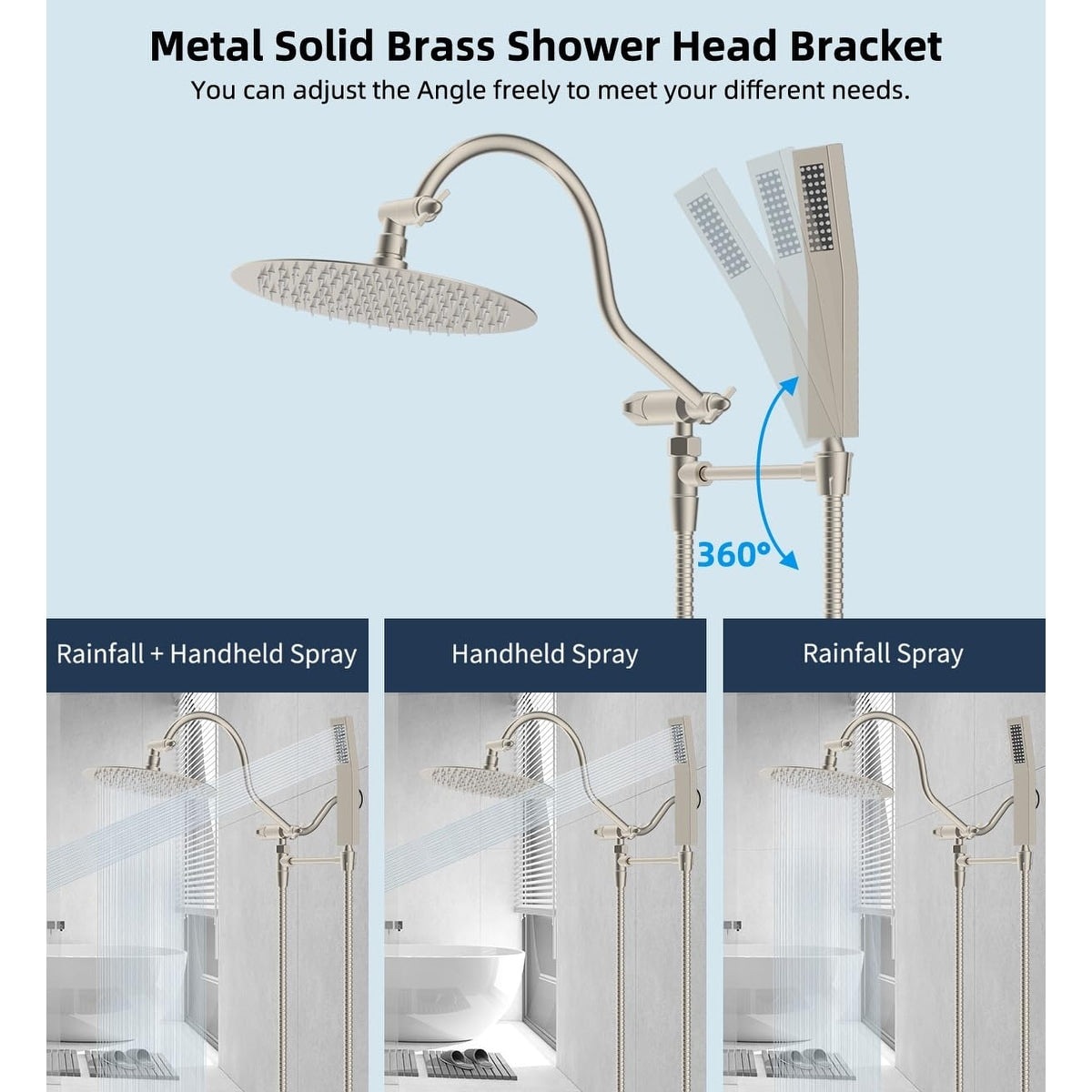All Metal Shower Head, 10'' High Pressure Rainfall Shower Head, Showerhead Combo/Handheld Shower Wand, 12'' Adjustable Curved Shower Extension Arm, 71'' Shower Hose, 2 Shower Holders