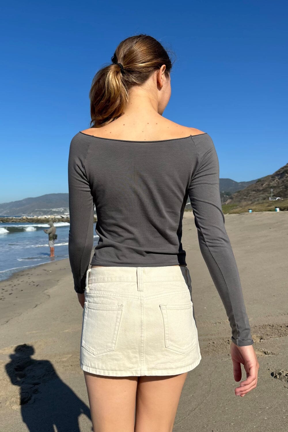 Cotton blend off the shoulder long-sleeve top with a raw hem.