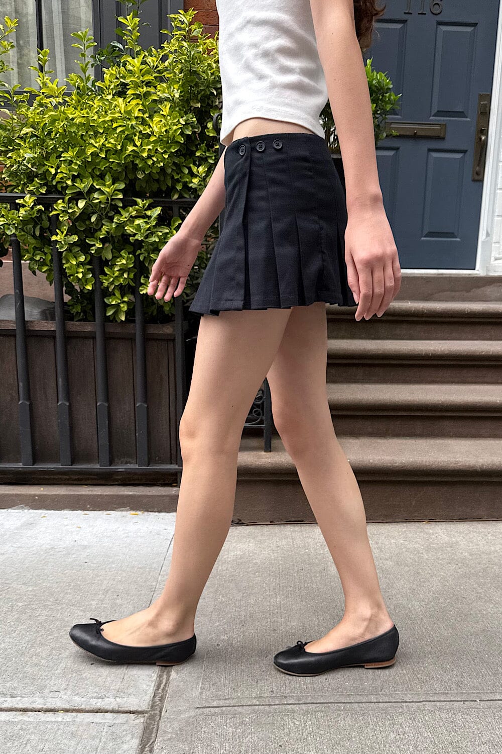 Pleated skirt with side buttons and adjustable waist.