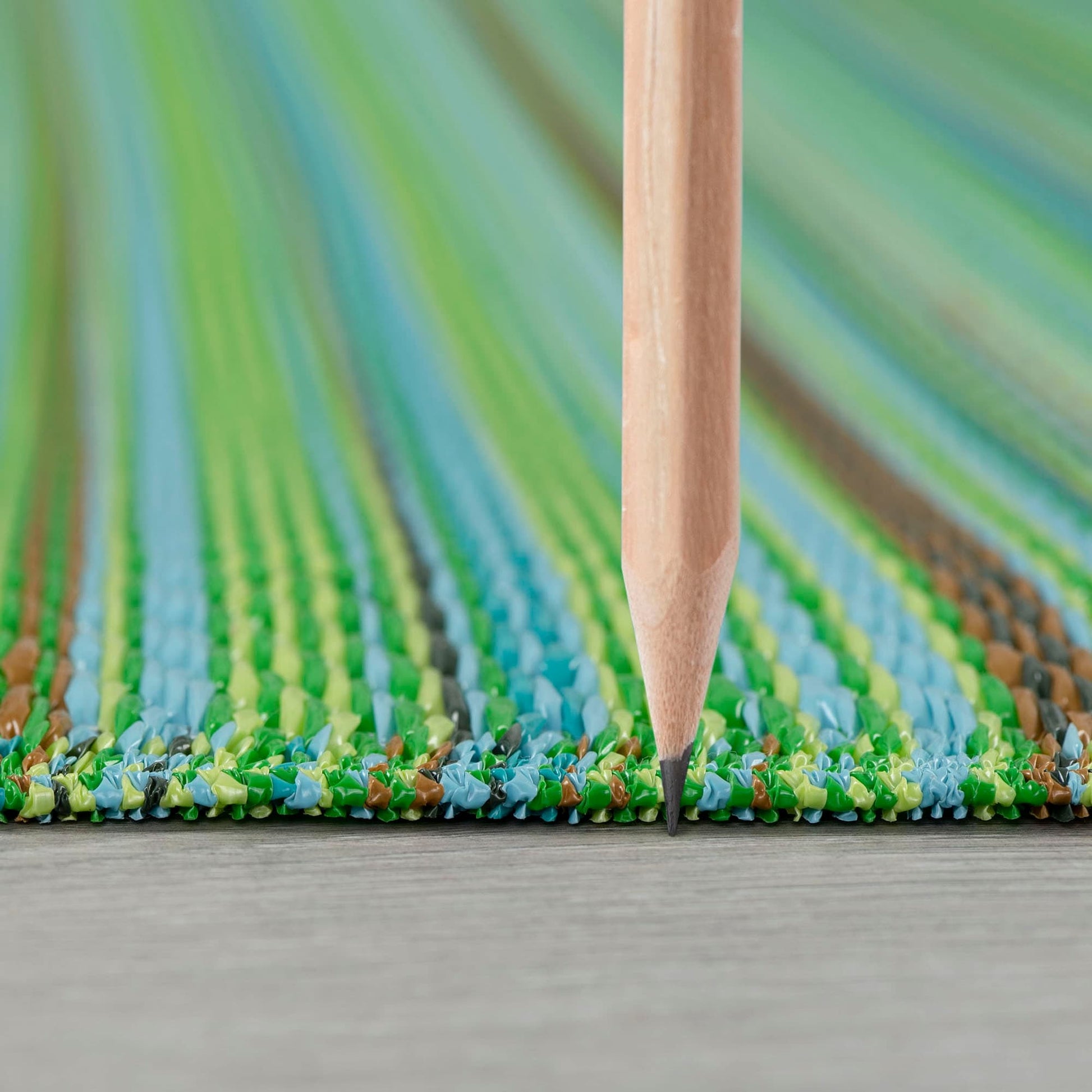 This trendy urban stripe area rug has unlimited appeal and is a winning addition to any indoor outdoor space. Built to achieve and treated with UV resistance to stay vibrant. Perfect for a family room, sunroom, porch, deck, den, living room, playroom, nursery. May be cleaned outside with mild detergent and garden hose, allow to dry thoroughly. Spot clean with mild detergent and water when necessary.