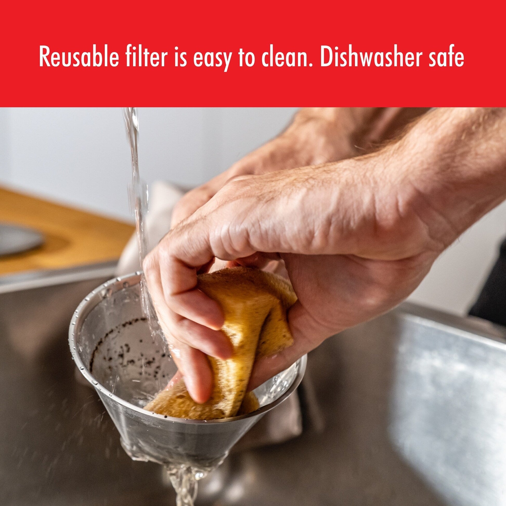 - Durable 18/10 stainless-steel filter won’t corrode or rust